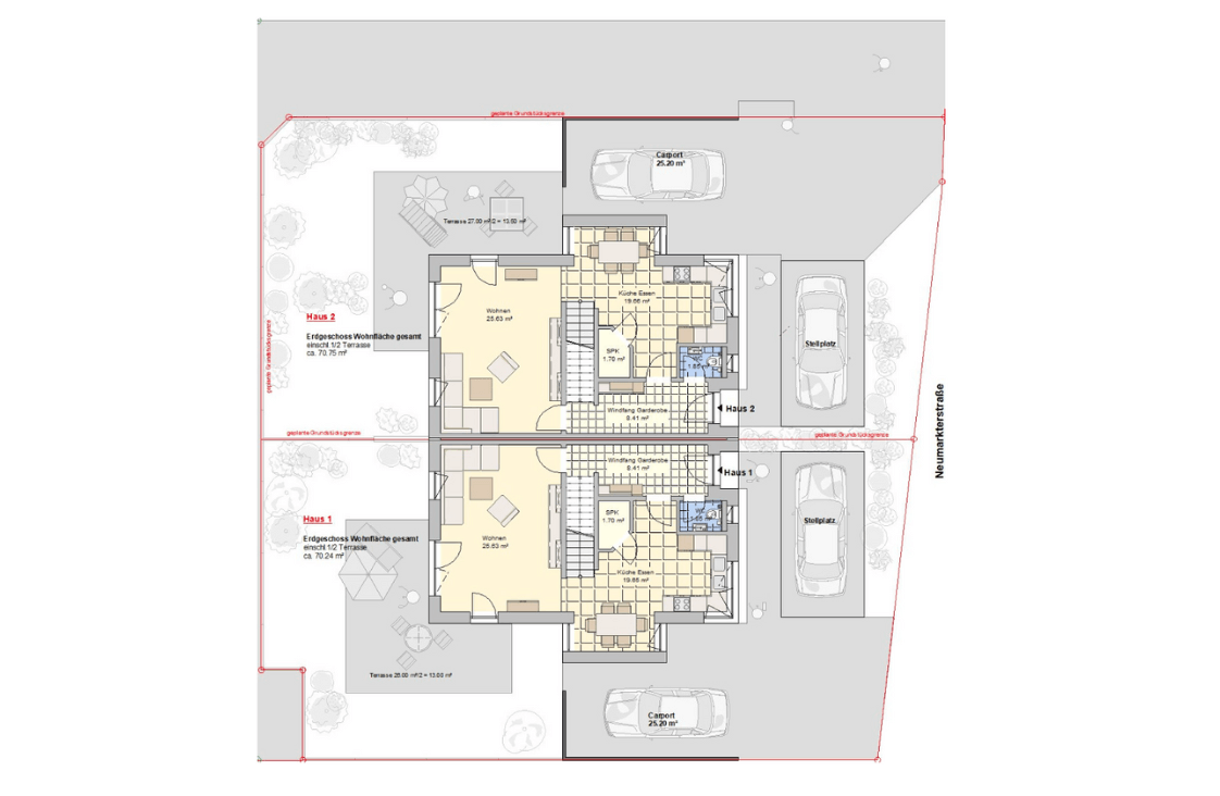 Fahr- und Gehwege, Stellplätze und Carports mit versickerungsfähigem Betonsteinpflaster; Grünflächen planiert (Bepflanzung durch Käufer). - Terrassen und Zäune: